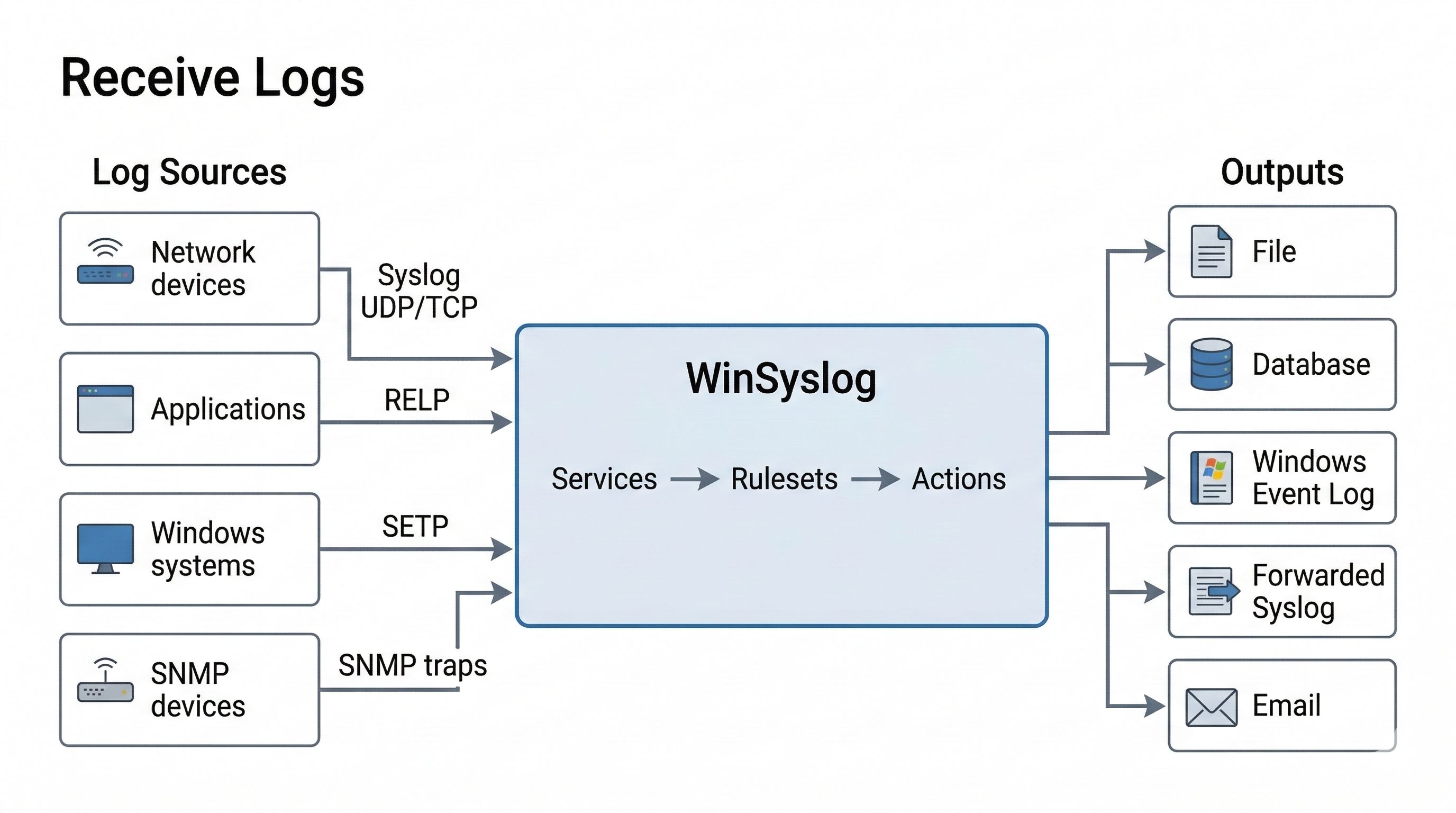 WinSyslog can receive logs from multiple source types, process them through services, rulesets, and actions, and then store or forward them to downstream targets.